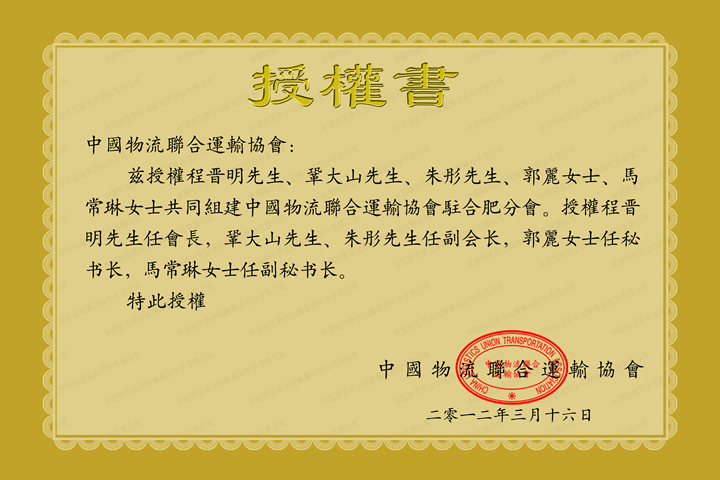 中国物流联合运输协会合肥分会授权书
